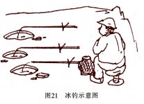 (1)钓“两头”,钓“炸”冰。以天津地区为例,进行冰钓是从每年的12月中旬至翌年的2月 底,大约75天。在这70余天里,一头一尾各有半个多月是鱼的摄食高峰,俗称“冰钓两头”。“炸 冰”,是指在晴好天气的上下午,因热胀冷缩形成的自然现象。“炸冰”的响动会促使躲藏起来 不爱活动的鱼儿受惊而四处窜动。当它们游到饵钩前看见美味,绝不轻易放过。因此,有经验 的人一听到“炸冰”,就会立刻聚精会神盯紧冰洞中的浮漂惟恐误漂失鱼。