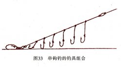 (1)串钩在绑法上要有所创新,子线应粗0.2毫米、长15厘米,主线长1米、粗0.3毫 米,钩用4号和8号伊势尼。大小钩位置要错开排列即一个小钩,相隔15厘米再拴一个大 钩……这样依次拴下去,1米长的主线大约能拴大小钩共6个。