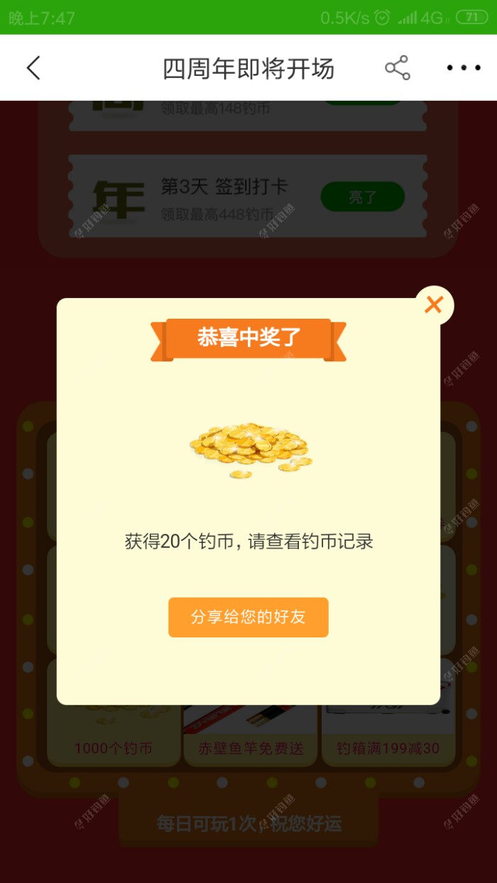 平台给钓友们发福利,今天签到第三天,领取164钓币