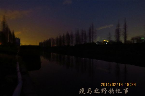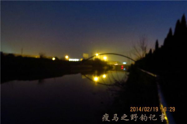 18:20才到钓点,但不是杀鲤的钓点。今天的潮水时间有点尴尬,开闸时间估计是在19:00左右,关闸时间估计在20:30。所以去早了没用,你狂 拉300竿打好窝子,他开闸。所以磨磨蹭蹭的在家呆到18:00。石庄钓友小朱电话来问,今晚搞不搞,被他一勾引,顿时毒发,于是上车出发。路上就一直在 考虑开闸的事,想想都有点窝火。途径那条运河东边的那条运河时,不由得下车看了看水情,没开闸。一般这个运河闸口不咋开闸,水质有点那个啥,所以一直没有 考虑,但今晚实在没地去了,看来只好这里先搞搞了,一会等关闸了再去西边。