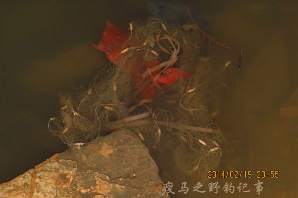 20:55分,撑住撑杆的砖头被我一脚踹到河里去了,撸大师二话没说,就帮我下水捞砖头(他穿着雨靴)。低头看撸大师捞砖头的时候发现钓位下面竟然还有丝网。
