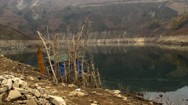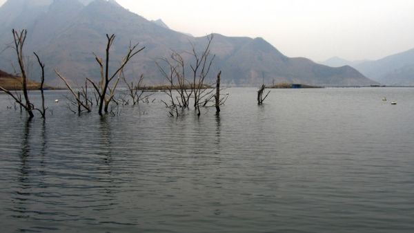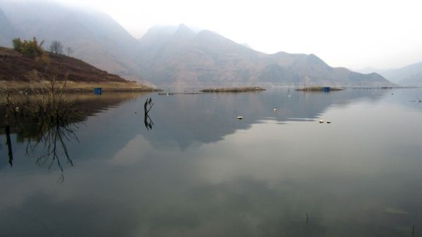 水位比上次降了20多米。右前方远处淹在水中的两个小岛已经露出水面2、3米。原来3号棚右边只露出尺许的一蓬枯竹已经高高的站在岸上。岸边的坡度较 缓,10多米远都能清楚的看见水下的枯树的石头,手竿根本无法施钓。四弟和小代只得上了右边的2号棚,并把棚子向左前方移动了2米多。3号棚的前面有一 7、8米宽的凹槽,凹槽内的水深有5米多,用5米4的手竿钓没有问题,我和儿子就分别在3号棚的左右安顿下来。