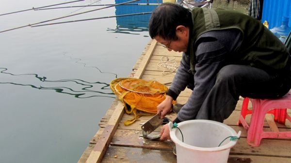 2月16日,天还是阴沉沉的。风向转成南风,感觉更冷(没有搞懂为什么刮南风反而降温)。从早上到傍晚,一个口都没有。大家把钓上的鱼剖了做糟辣鱼吃。你还别说,新鲜鱼做糟辣鱼真好吃。