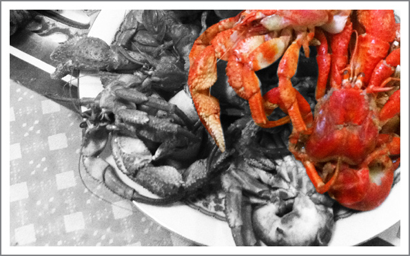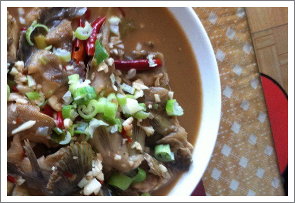 漂了一天,鱼毛没见,不过这伙食着实是让人耳目一新,满地乱窜的寄居蟹,栗子般大小的香螺,下锅前还张嘴骂人的大黑鱼,黄鱼、鲅鱼乱炖,老板又加了个时新菜,凉拌海蜇,下手吧,还等啥?
