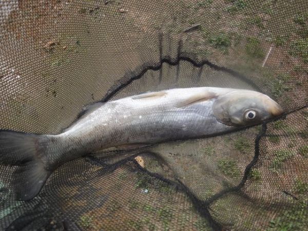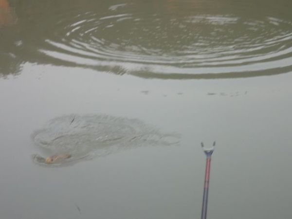 抛了两个多小时,时近中午,终于有口了,力道很大,我以为是条鲤鱼,搏斗了10多分钟,终于进了我的抄网。