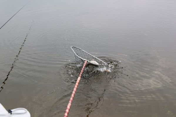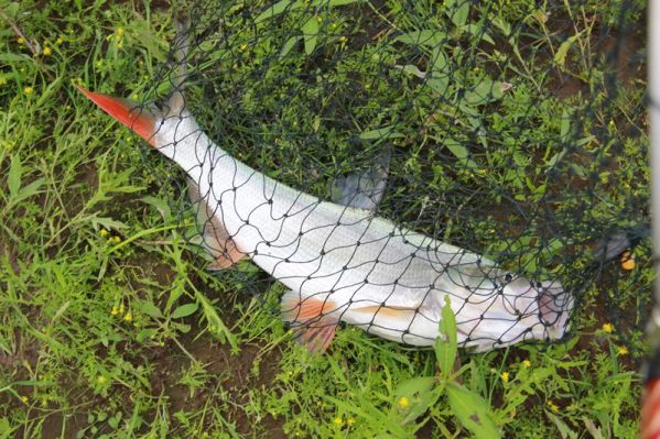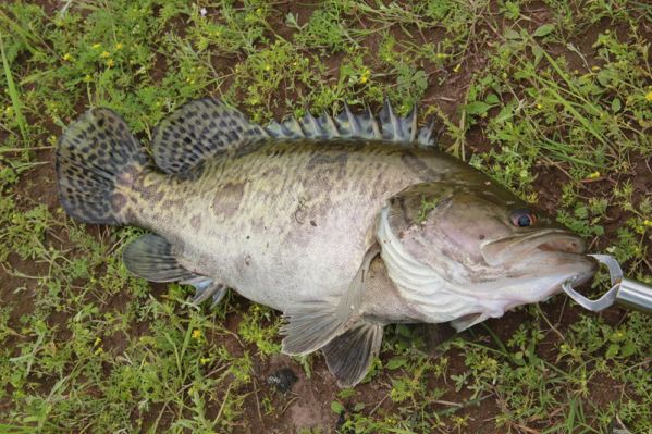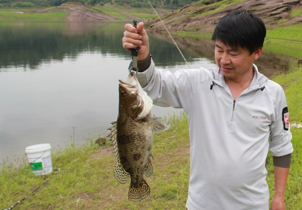 没带抄网 好在岸边比较平缓把鱼拉到岸边 直接用脚踢上了岸 这家伙的背鳍很厉害不小心会扎伤的,上鱼后不久钓友已经喊我收杆了没想到收杆鱼竟然是目标鱼,很幸运!