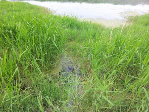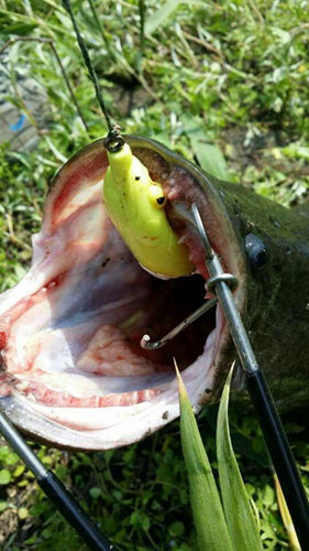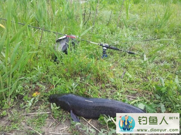 吃过饭接到老贾电话说去打黑,约好会面地点之后我出发了。45钟后到达雷场,这个雷场是我前段时间探钓发现的,亮水较多不是重草区比较偏僻很少有人光顾, 里面必然有巨物,蛙直接打到对岸轻轻一拉一个好大的暗涌跟过来没咬,根据经验肯定是条老黑,顿时信心大增。不急慢慢逗,只要它能咬上一口抛一天我也愿意。 见到老黑的动静老贾也过来了,抛了大概不到一小时吧老黑终于开口了。还是老方法蛙打到老黑出没的对岸轻轻一拉 对面草窝里面一个暗涌又跟过来了,随即“嘭”的一口好大的炸水一个大闷声仔细一看蛙在老黑炸水的地方上下晃动居然没咬到,心都快跳出来了。沉住气,轻轻的 原地抖动,又来一口 “嘭“一声蛙消失了线横向移动。血脉扩张要杀杆了。马上一个下蹲接一个暴刺钩牢牢的扎进老黑的上腭。老黑开始发威伴随着水下的泥浆在水里面翻江倒海拼命的 往下钻。不管怎样一定要把杆子竖起来绷紧哪怕断杆也值了。就这样坚持了大概有5分钟,老黑终于体力不支慢慢的被一点一点的拉动,头出水的那一刹那老黑再次 发威疯狂的洗腮嘴巴张的老大,头往二边拼命的甩噼里啪啦的拍打着水面,老贾也是经验老手了赶紧边摇轮边后退借助身体的力量把老黑往岸上拖不能给他喘息的机 会。终于老黑成功上岸,一颗悬这的心终于掉下来了,激动万分啊!这么大的巨物可遇不可求啊!鱼拉上岸的过程中雷场边上的芦苇都被老黑的尾巴给打折了,同时 老贾也累翻了,加上心里面很激动足足休息了半个小时才缓过神来。奶奶滴它咋就没咬我的蛙呢。人品啊人品!