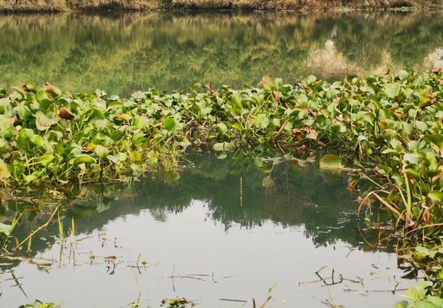 如果钓点靠岸边有很多水草,比如下图展示的那样,靠岸位置有很大片的水葫芦,钓友们借助工具掏了一小块可以下杆的位置。那么遇到这种地方,鱼竿最好不要用太长,不要抛到水葫芦区域的外面。