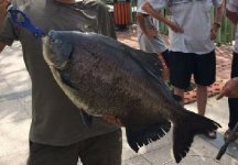 捕鱼的经过是这样的,我打算在在鱼吃油条的时候,把波霸投到油条堆里,终于,在拖了几竿后一个大炸口,它就上当了。而我,也顺利地破掉了鲳鱼单尾记录。76CM乘以38CM,20.7斤!