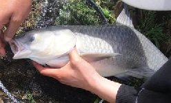 在上午拉饵对象鱼(翘嘴)无果的情况下,下午果断钓底,终于,浮标连续有力下顿,扬竿刺鱼, 力道不小,判断应该不是链鳙,(上午已经连续中了几尾链鳙)都放生了。在经过风和线呜呜作响几个回合以后,鱼渐渐失去了力气,露出水面。呛了几口水之后, 已经很有把握将其拿下,它也温顺了许多。几番倒杆,挺杆,它乖乖束手就擒。一条9斤大青鱼被钓上岸。