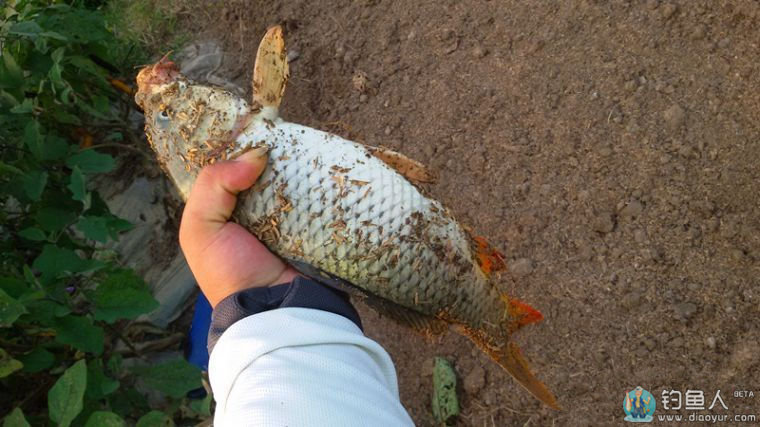 没想到鱼儿二度挂底,幸得塘主下水,暴力抄鱼,没有柄的抄网,孩舅提在手里。