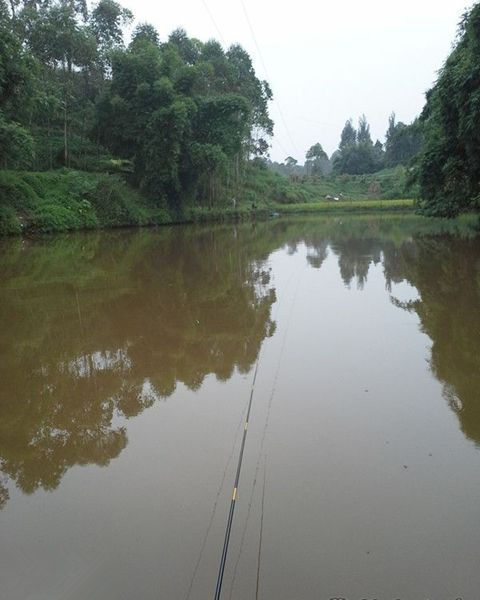 钓场是一个大约三亩地的散养塘,在两山之间,呈长三角形,坝口水深在1.5米左右,坝尾水深在0.8米左右,据说是没有刻意的喂过,鱼不多,但很久没有清过塘了,有大家伙,先来张全景吧