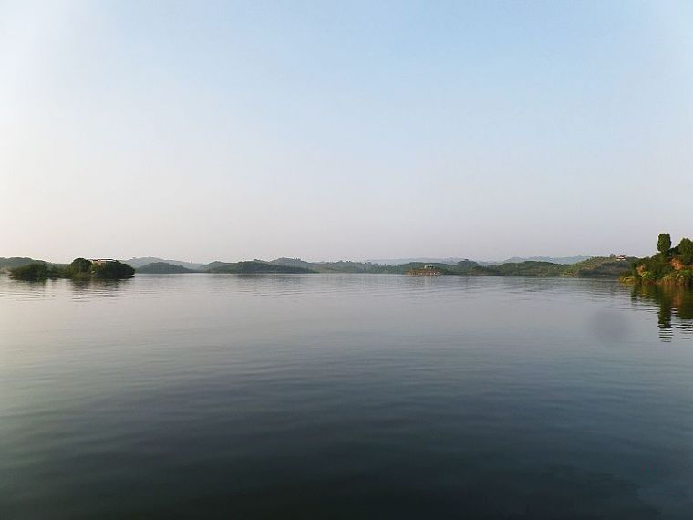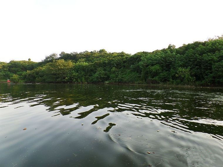 到达目的地,水平线上的远处,有一个不小的岛,现在只留下一片小树林和一幢三层楼的房屋,给人感觉大水即将淹过屋顶,其实不然,还早着呢!