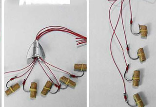 串钩+爆炸钩钓底是将串钩、爆炸钩两种钩组合起来使用,钩饵的增多,使中鱼的可能性有所提高。但是,将串钩、爆炸钩两种钩集合后下垂线会加长,使得抛投不方便。而且钓钩众多,容易出现挂扯现象,抛投时必须十分小心。