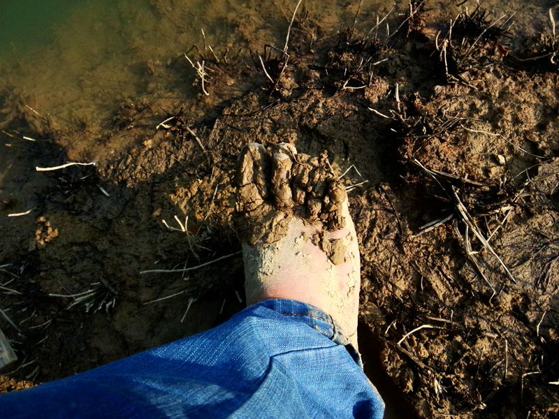 太阳下山了,水边很凉,已经忍不住披个外套,可怜的双脚还赤裸踩在烂泥里。