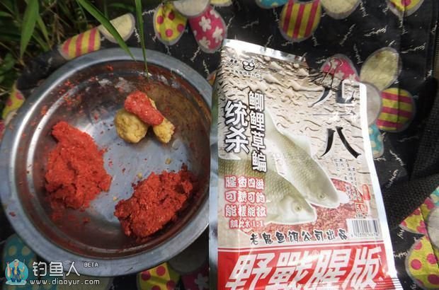 其实今天的饵料很简单。深秋已凉,便带了这款“九一八”野战腥版。按说明加水和饵以后,分成两半,一半再沾点水,调得更软些。