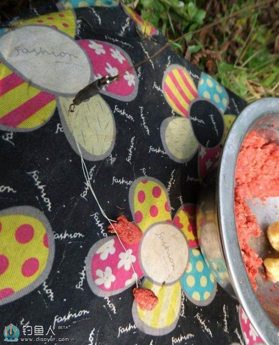 至于窝料,就是用玉米面饵拌进少许这款饵料,拌匀,攥紧成鸡蛋大小,3颗,丢到浮漂上即可。
