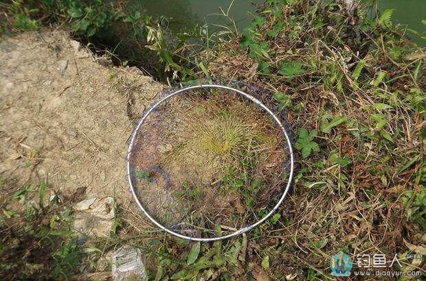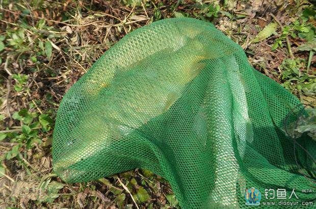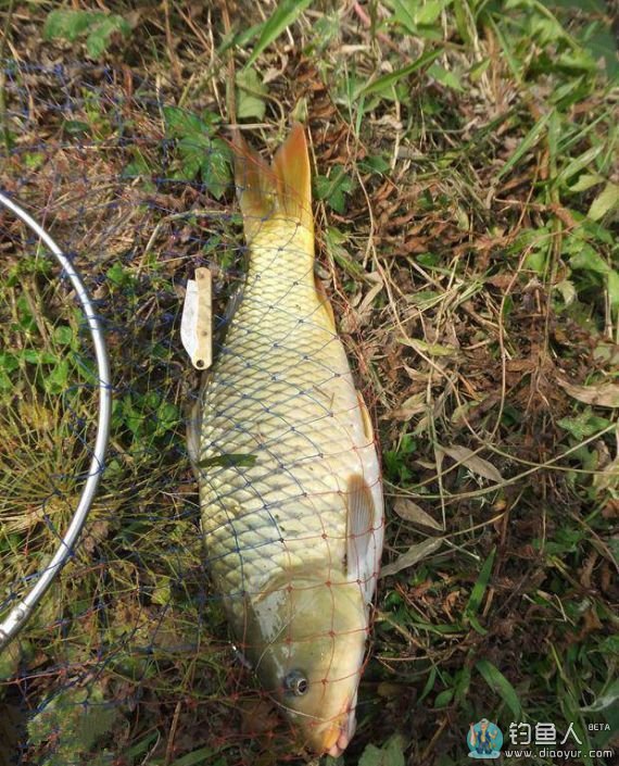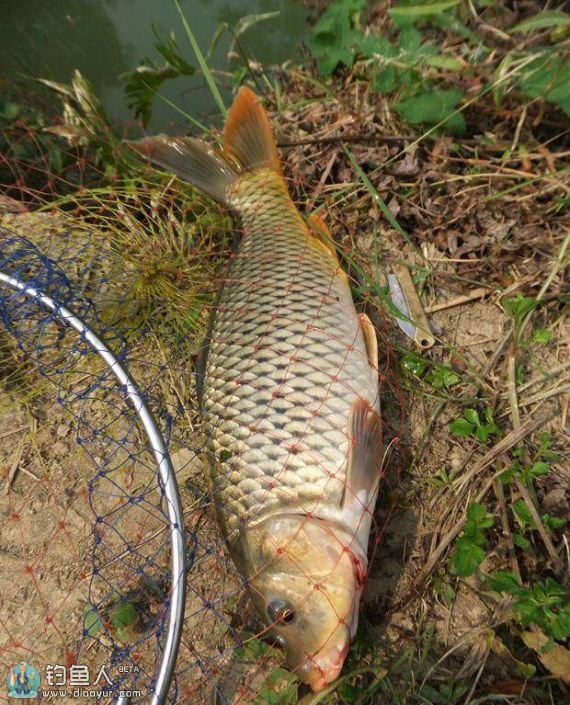 遛不到2分钟,鲤鱼便有气无力不再动弹。这时,我右手举竿,一脚踏入河边的一小块凹处,一脚扣住河沿的杂草,坐到河岸,左手拿住抄网,总算抄住了鱼头!