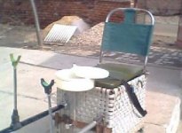 钓箱全景:真皮坐垫、钢筋铁架、帆布靠背、耐磨塑料布条编织(透气性好),钓箱,前部双腿自由升降(据传某某厂家生产钓箱可自由升降便由此而来)。