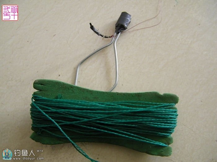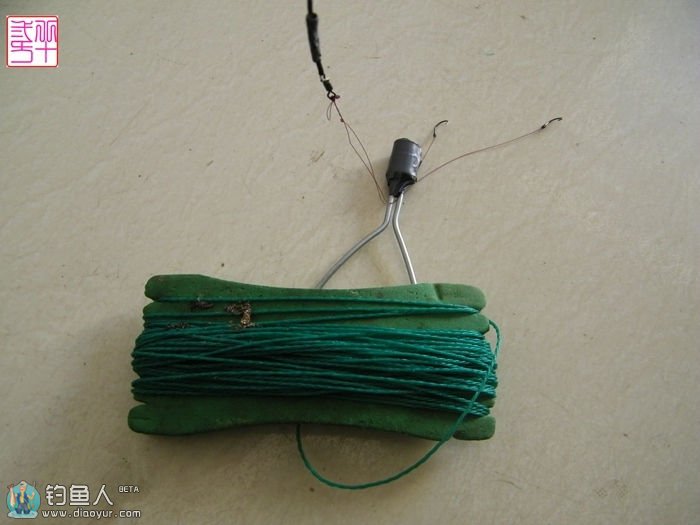 实际操作时将菱形的铁丝圈沿钓竿的手柄处一直向竿稍滑下沉至线组挂底的位置,在拉取钩器线的同时也要拉动线组的一端,一般较复杂的挂底情况都能轻松搞定。只需几分钟的时间一个简易的取钩器就顺利的完成了,既简单又实用,携带起来也方便。