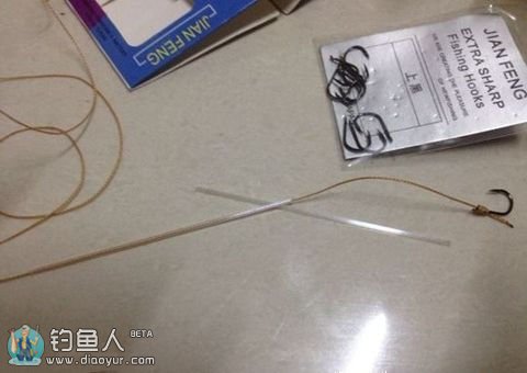 将棉线穿过软管,软管可以用药瓶子的小吸管,绑上钩子后预留一定长度的钓线,然后打结,阻挡软管滑落
