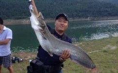 我们三人各自分散找点口很少,一会钓友小谢大喊“上大鱼了”。我马上跑到他的钓点,鱼一直要线到20几米时才没什么力拉回头,10分钟左右在我与小谢的帮 助下把鱼拉出水面。经钓友电子称重22斤长110厘米,这是他今年钓的最大鱼。现场围观钓友与农民很多,在大家七嘴八舌讨论中,钓友东东激动万分,后经钓友东东讲是搜底中鱼。