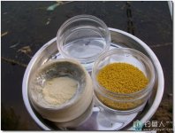 物料准备:三个小盒分别装粘粉(胶粘米)、小米(小米必须是干的,可以用化氏的麝香米,具体用麝香味的还是药酒味的请依据当地鱼情调整)、水。(也可以用量杯来替代,以上材料商城均有售,好用不贵)。