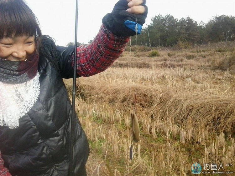 老婆率先上鱼,仔细一看,开竿鱼竟然是挂上的,看老婆笑得多开心。