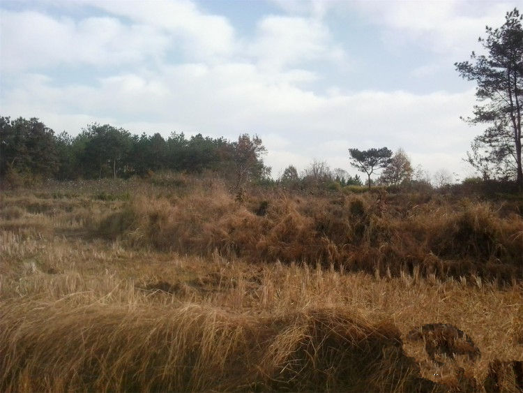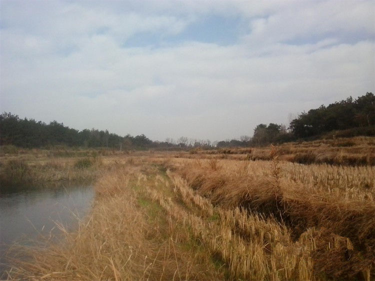 右面是地势渐高的大片田野,依稀可以看到一排树的地方也是一个大塘,上次去探查过,插了红旗,表明是有人承包的鱼塘。
