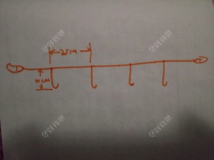 串钩我准备绑4把钩子,钩子子线长越10cm,两个子线节点的距离为25cm,子线的节点距离要大于相邻子线长度总和,避免抛投的时候相邻子线缠绕。