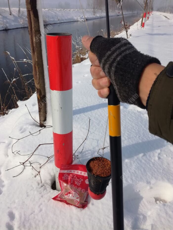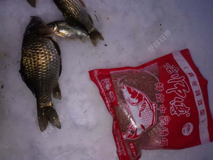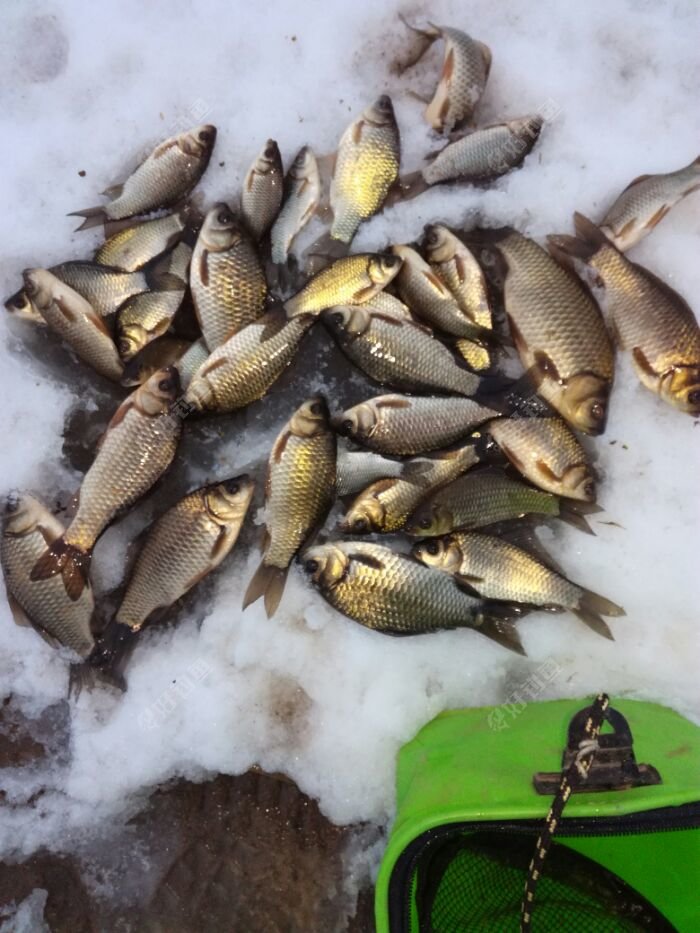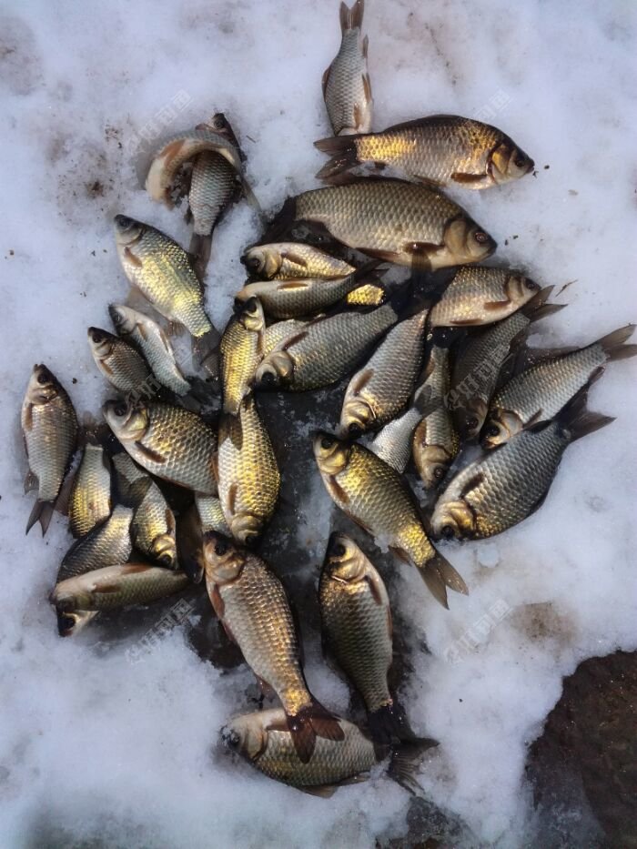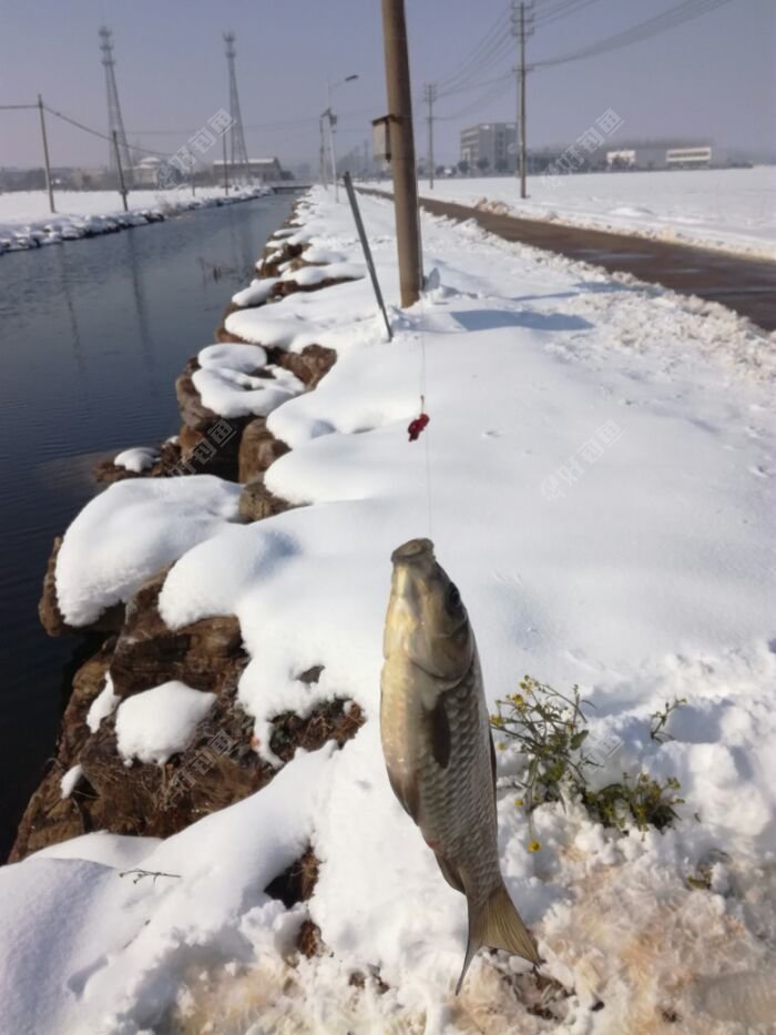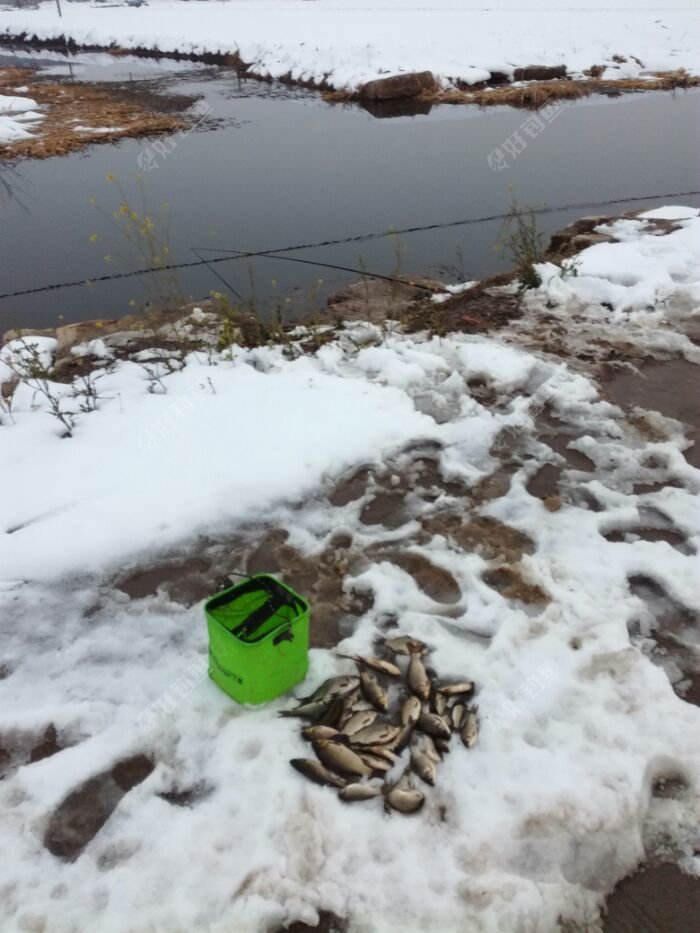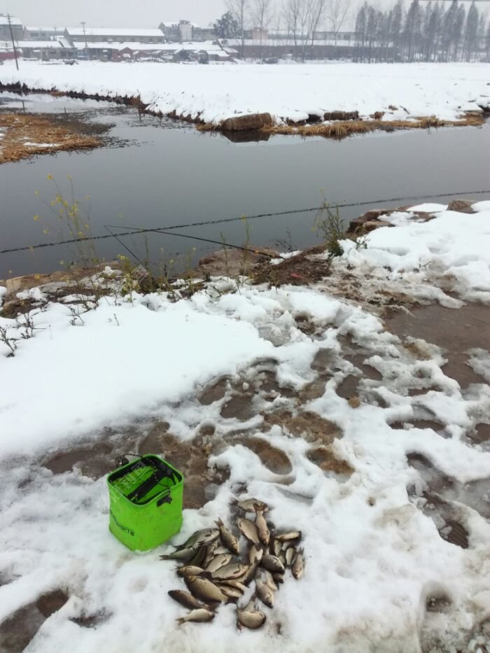 昨天淮安地区猛降大雪,最厚达23厘米,实测。早上睡个懒觉出去溜达一下,听说镇政府门口河里有鱼,骑个电瓶车看看,水深还行。回家拿工具,打了3个窝。打好后10:15,回家烧饭。吃过饭,接近11:40,出去钓鱼。到了钓点,调好漂,挂红虫,下去等一会儿,漂下沉,然后顶漂,半目。提竿上鱼,1两五左右,感觉不错。三个窝,断断续续上鱼,其中一个窝在三岔口上鱼最多,还大。其它两个窝,鱼小 ,相对稀少。水底水草不少,不是很好钓。5:00收杆 ,收获小鱼3斤左右 ,比较满意。零下8度到0度的天气,能钓到就不错了,有这样的收获,满意了。 看图!