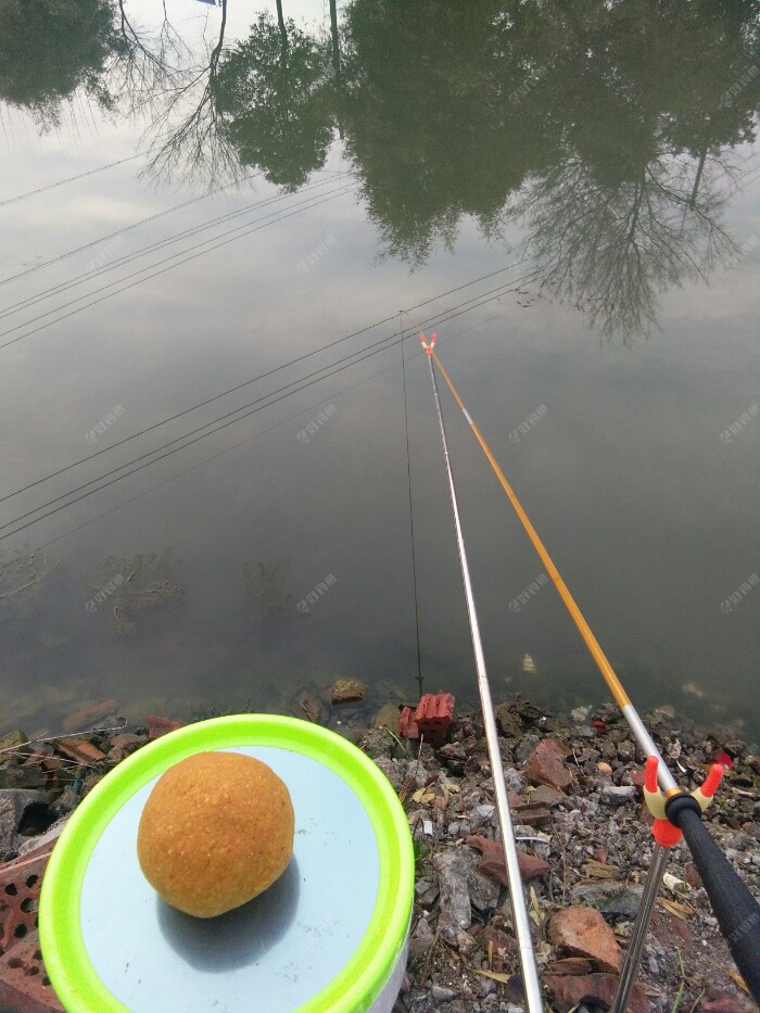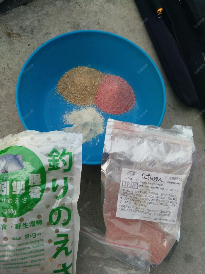 不一会便到了钓点,选好钓位安置好钓箱,调漂打窝。尔后二种铒料各50%,再加了些拉丝粉,醒铒等待。