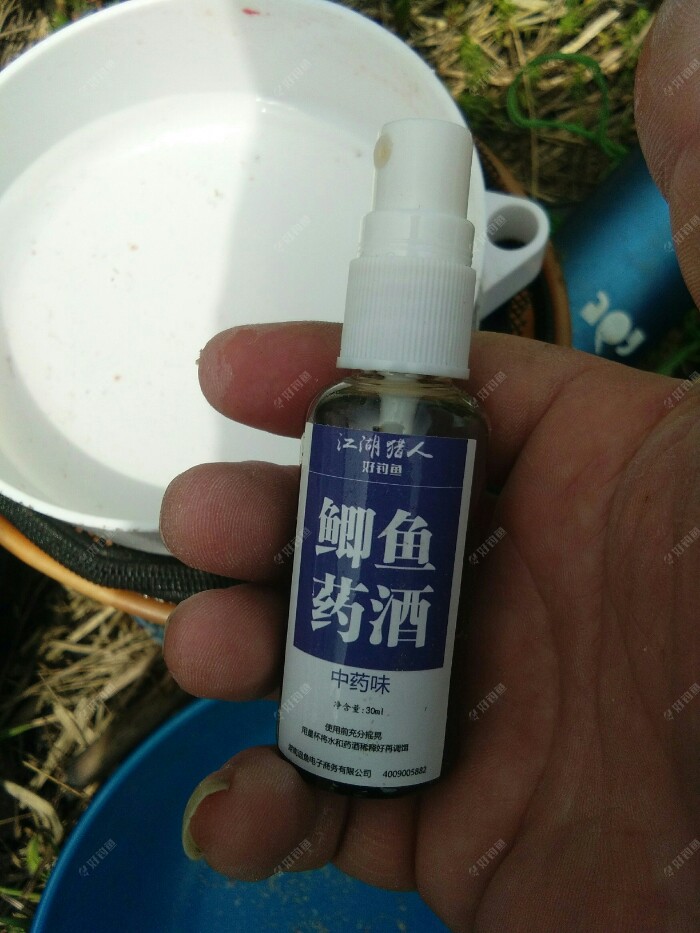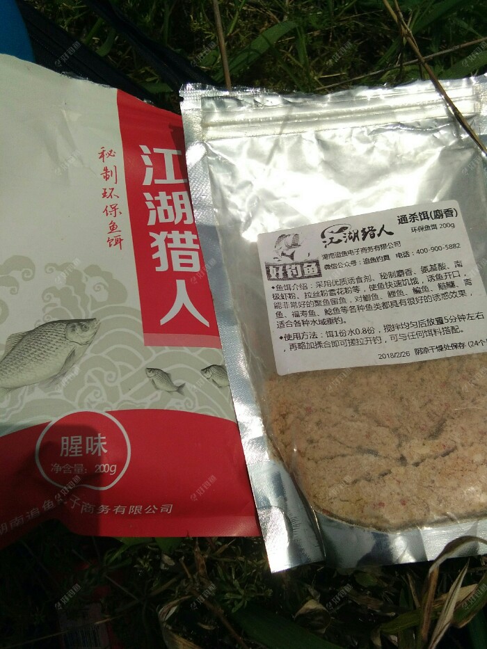 饵料没了,马上重开。这次我用了江湖猎人腥味鲫,通杀麝香饵,加了约15%的拉丝粉,平台的小药鲫鱼药酒还得再试试。