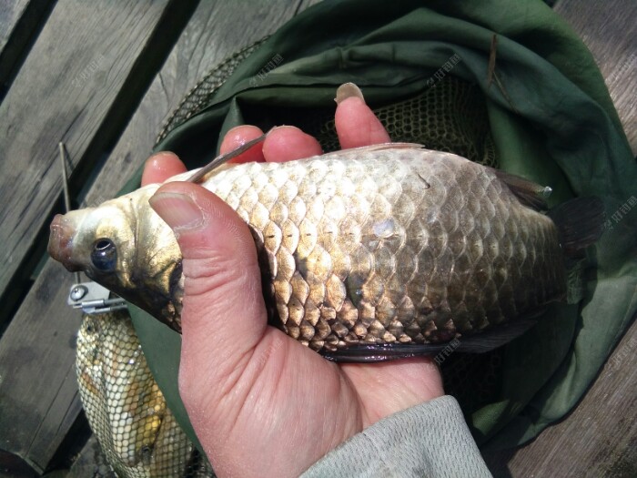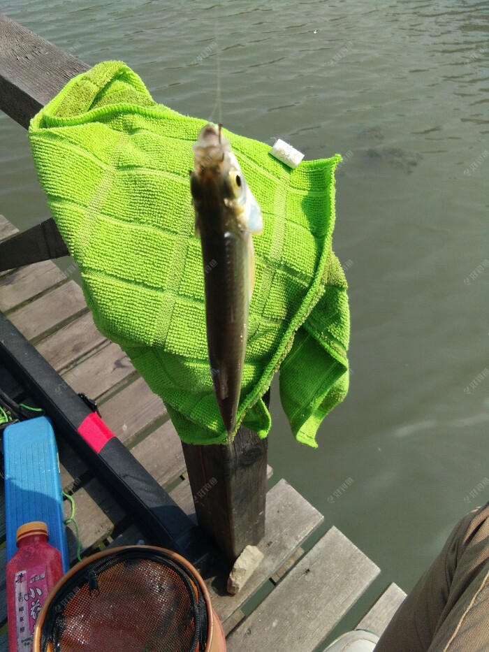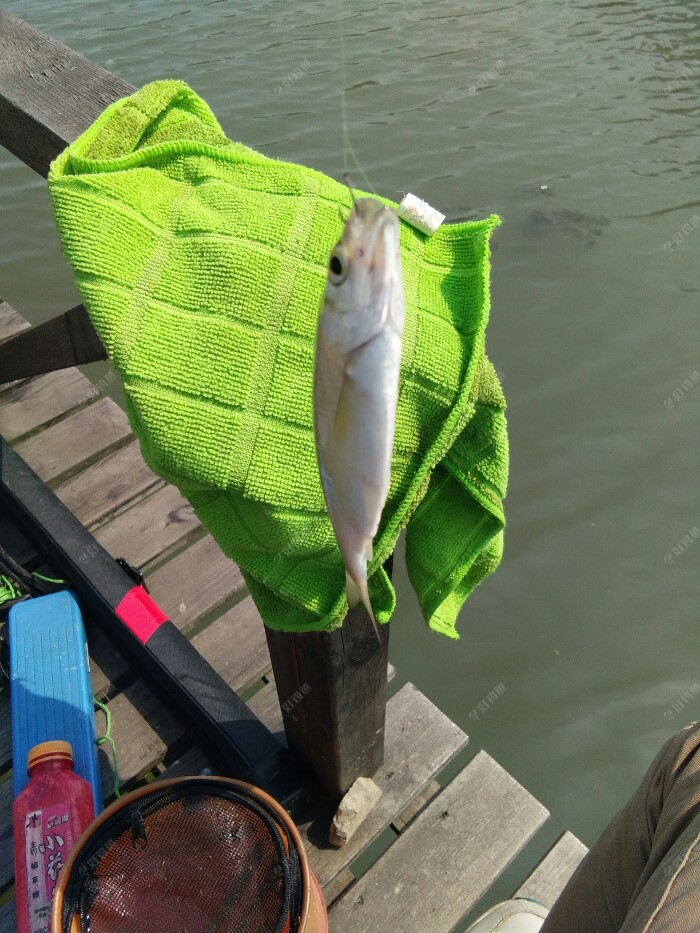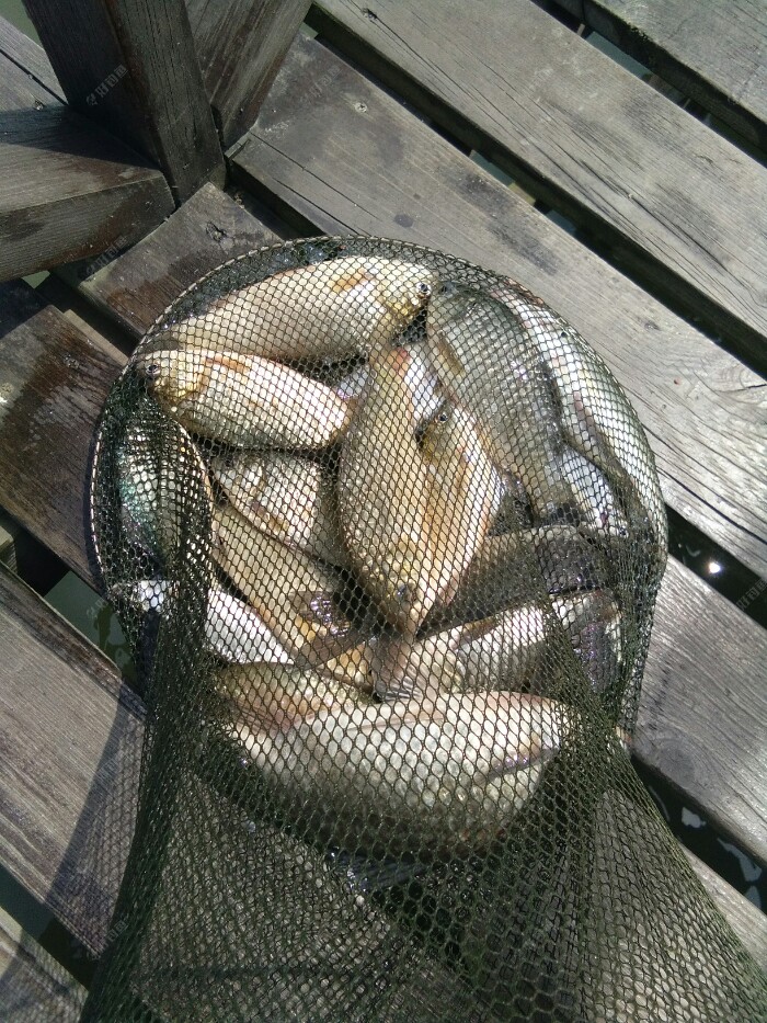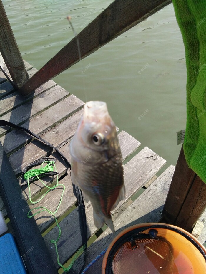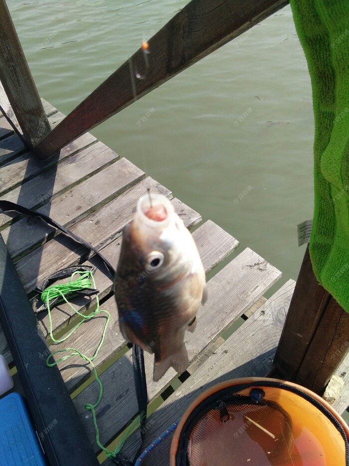 早上来的时候还是风平浪静的,除了远处的餐条被翘嘴追逐着在水面四处逃窜,泛起的波澜,真的好好平静啊。 而就等我把钓箱支架鱼竿调漂一切都到位了,风刮的也大了,水面的波浪起伏着,增加了我观漂的难度。 太阳出来了,气温也在慢慢的升高,平台换的钓鱼服正好派上用场了。赶紧的穿上以防被太阳哂成了非洲人,也显摆一下咱是有组织的人阿。? 昨天开的江湖猎人饵料没用完,今天就接着用。3米9的钓点近2米深,我一竿接一竿的抛了近1个小时,没有鱼吃口。是不是钓的太深了呀,自己在心里寻思着。想着再没口就撤了,到永丰村去拉小鲫鱼玩玩。 这钓点鱼口来的慢,还好有口了,抓住一个顿口,一条餐条上来了,相比昨天钓的小。不管它了,只要有口就行。接连上了几条,又仃口了。难到今天就这样了?要不还是到永丰去? 正想着这事,只见浮漂慢慢的顶起来,然后一个小顿口,抓住了。抬竿刺鱼后感觉了份量。是鲤鱼?37调的细竿刹时弯成了大弓。慢慢的遛鱼出水面并且带离窝点,原来是条大板鲫啊,高兴坏了,终于实现了愿望。廊桥离水面1米多,·4的子线不敢直接拎。 还好吸取了钓友的教训,从不带抄网的我,这次带了,就是想着以防万一。