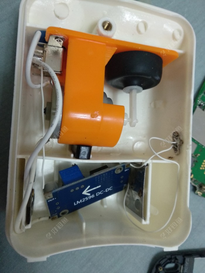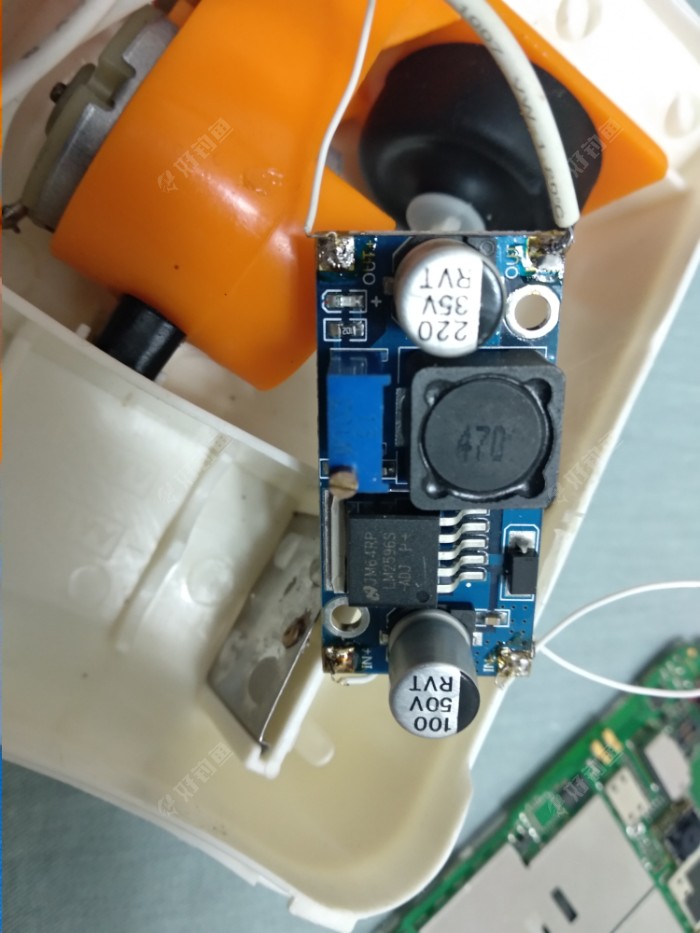 这是接好的DC降压模块,就两进两出四根线,这个氧气机是1.5v供电的,移动电源和充电器一般是5v的,所以要用这个来降压,usb接口引出正负极接in+和in-,输出接到电机和开关上,没难度,再把它放到电池仓里,完工。