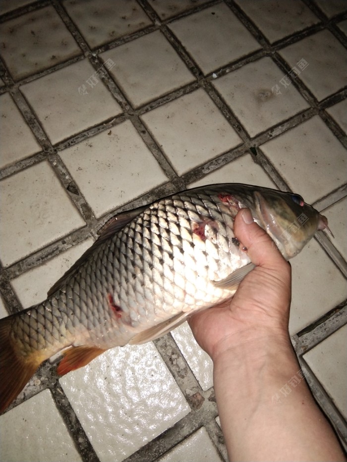 继续拉饵抛竿,只见一有力的顿口,随手扬杆刺鱼,鱼的重量立马传递到我的手上。由于驳岸较高,我小心的溜着,过了几分钟,把他擒起,这条鲤鱼3斤左右,拍照留影,随后放它一条生路。