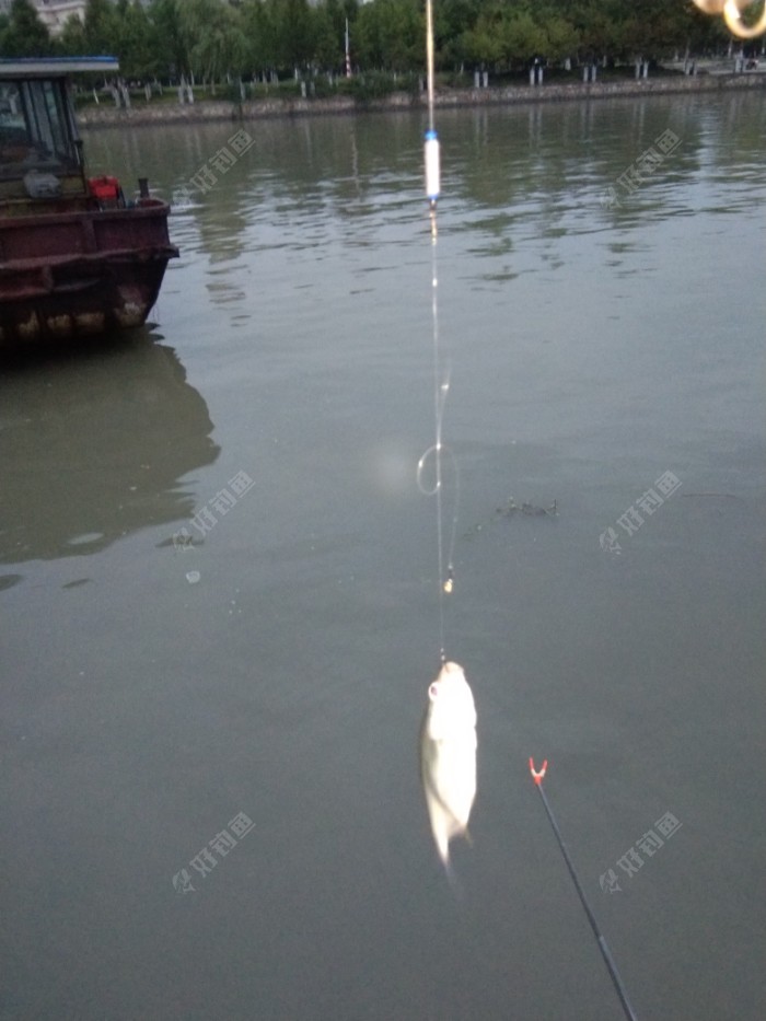 吃完晚饭了,没事,到南边的大河边去溜一圈。看到有个人在钓鱼, 兴致来了。于是立马骑着电瓶车回家,拿上钓具,赶到河边。一个来回只有5~6分钟,多近啊。这条大河东面直通浏河长江口,南接上海,西连昆山,苏州,是条名副其实的黄金水道。 周围的游人络绎不绝,四周的景色相当迷人。我选了个没有栏杆的平台作为钓点。连续的拉了十几杆后,浮漂有了动作轻微的往上顶,扬杆一条小扁鱼随杆而上。