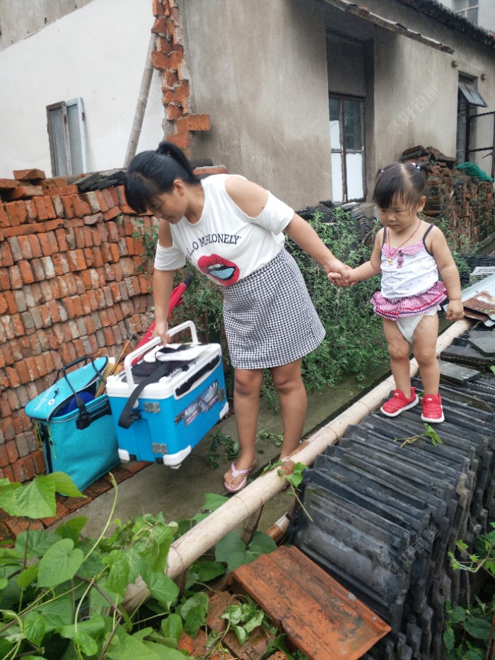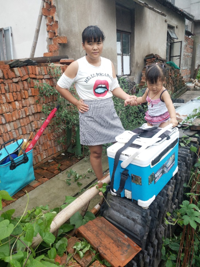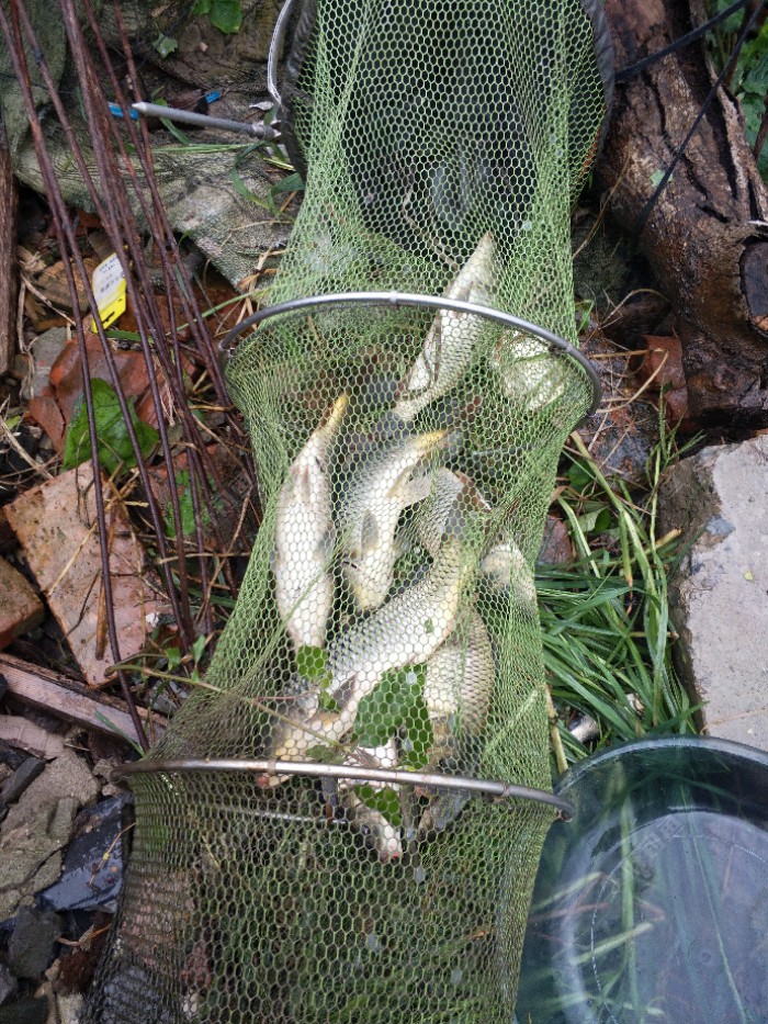最近台风特别多!今天它又来了!还有大暴雨!所以不敢乱跑!出去了又是暴雨又是台风,打不了伞那就惨了!算了还是陪掌柜的在家过七夕节吧!快到中午了,实在忍不住了!因为深深地知道下雨天必然会爆护的道理。十点多果断拿起装备!决定今天不走了就在家里钓,对没错就在家里!我住的屋后有个小河沟里面小鲫鱼小鲤鱼很多,就是浅了点最多一米五!3.6的竿可以打到河中间!我喜欢用长竿在大水面钓!今天没办法了,屋后背风可以打伞,又不用跑远。省的遭罪最重要的掌柜的支持在屋后钓鱼那样可以陪她女儿可以随时回家吃饭睡觉!这样真是一箭三雕的没事何乐不为呢! 到了后面老规矩摆兵布阵十分钟后开钓,今天用的去年年底渔具店老板推荐的鲫鱼饵,用过两次不好用就一直放着。今天想试试,主要想用要看着闹心占地方!上次批发一箱化氏饵料。拉饵钓了二十几分钟没口,然后搓一竿下去就是个大黑漂!久违的大弯弓啊然后各种姿势各种凹造型!再看看没带抄网啊!我擦赶紧通知掌柜的!“喂快把我鱼护包里抄唉唉唉唉,卧槽!挂了吧!挂了吧”哎不能轻敌啊!!!!赶紧回家拿抄网!抄网拿回来接着干,抛杆到位又是大黑漂,起竿――遛鱼――抄鱼入护! 掌柜的一会来了,我说下面不少鲤鱼啊!话没说完“咻”又是一个!这次我让掌柜也过了把手瘾她一会把鱼溜翻抄了上来,把她开心死了。就这样一直持续到下午特大暴雨水位暴涨十几公分,没办法赶紧逃回家!