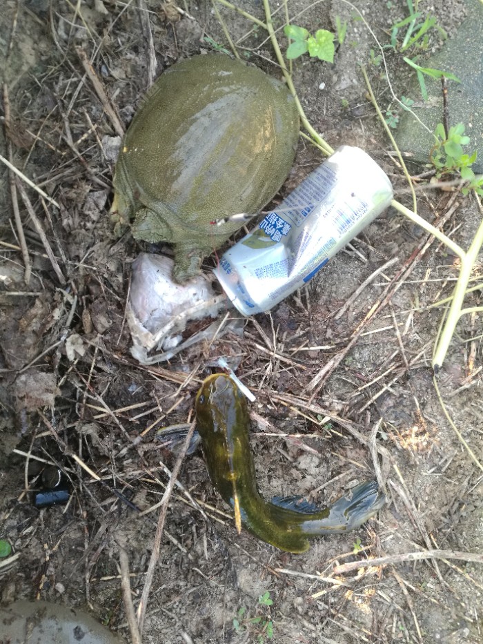以上是住在基地第一晚上插竿放钩的收获,大肚子嘎鱼和甲鱼又放回塘里了,让它长大点再来相约。下面是第二晚下竿的惨烈!断双钩,还有一条子线被拉断!不是遇到大物了就是昨天放回的王八搞得事,回来报仇来了!把我的钩子全部收缴了。。