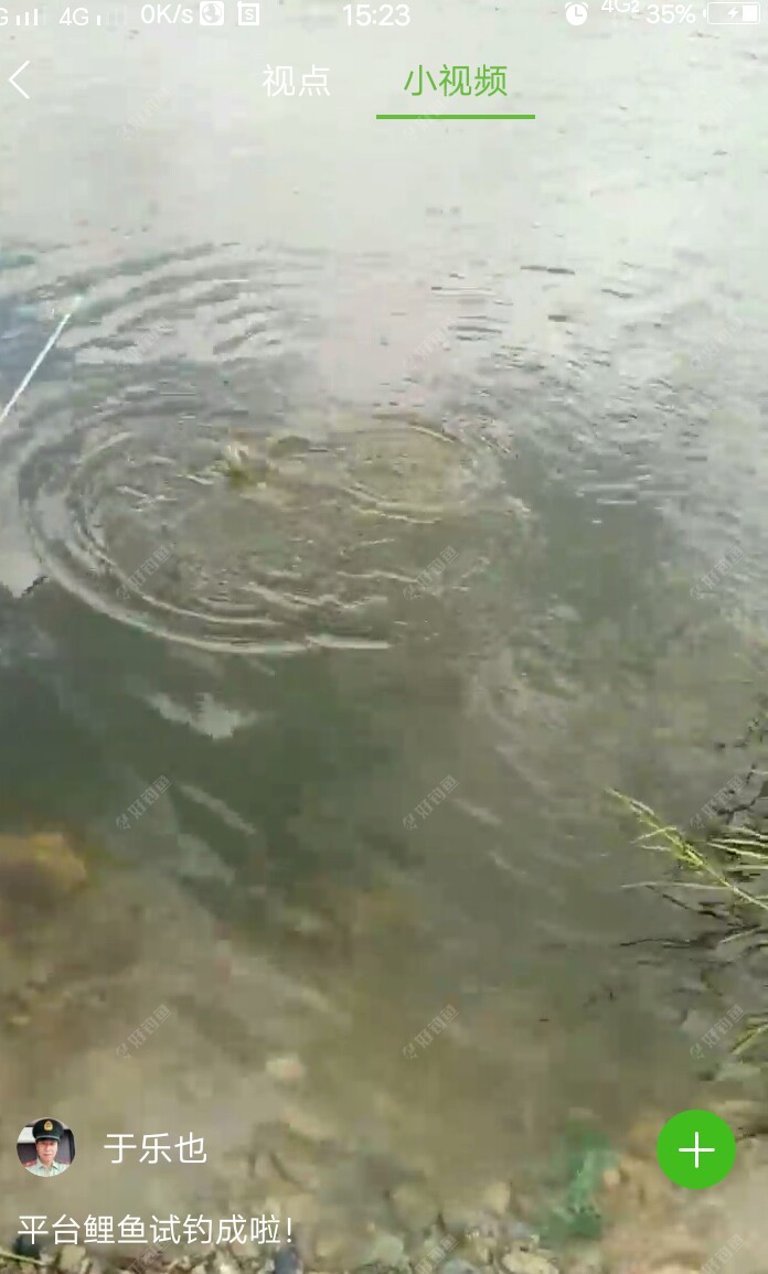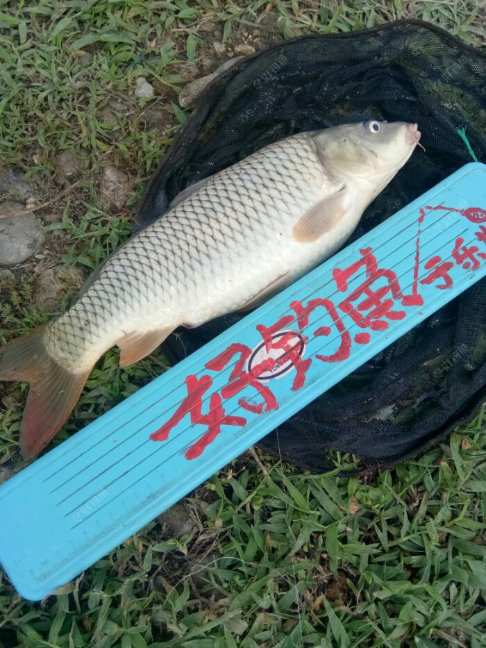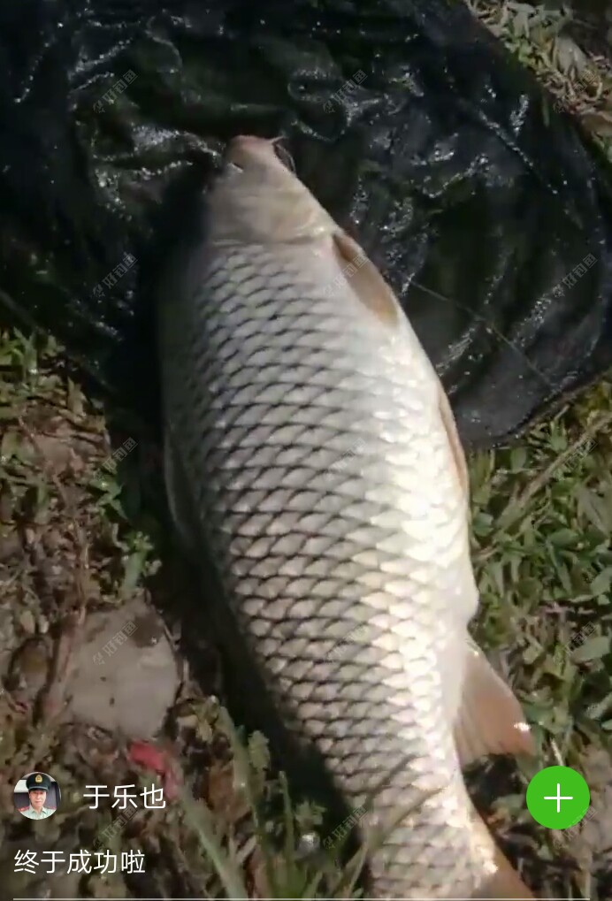 接下来,更为神奇的一幕出现了。就在我离钓上来上一尾鱼不到20分钟,大约在9点20左右吧,美丽的浮漂,突然一个有力的下顿,然后又缓缓的下沉。这次不是突然黑漂,我原先以为是一尾很大的乌头鱼来,感觉下面好有力道,但是根据我的经验,我的手感,我的判断,明显的不像鲻鱼吃钩后挣扎的状况。很明显的感觉是鲤鱼已经咬上钩了,它不像鲻鱼提竿时的暴跳,它虽然也狠暴躁,不安分,但是提竿时它很温柔的顺着我的牵引,来回的在水下游动。于是我一手紧紧的握住竿和它周旋,另一只手快速的掏出手机,用小视频记录下最精彩,最美好,最爽的,不算大太,也不算太小鲤鱼的一瞬间。因为我有足够的信心和线组,我的主线是2.0,子线是刚换新的0.8大力马线,钩子也是在平台上用钓币换的非常锋利的新关东5号钩。刚开始我就说了,我是有备而来的。所以我就死死的握住竿,和它潇洒走一回。也可能是平台上的鲤鱼小药的特殊,神奇效果吧,像打醉拳一样,东倒西歪的,一会儿上,一会儿下。一会儿左,一会儿右。似醉非醉。但是就是醉而不倒,不管我漂亮的大弯弓,在水面上空,蓝天白云下,不断的左一下,右一下闪现,它始终不肯露出它美丽的芳容。大约和它玩了有两分多钟吧,它终于精疲力尽,乖乖的顺着我的大弯弓的后退,顺从的来到了岸边,然后在一位好心的,看热闹的看客的帮助下,成功的用抄网,把它抄上了岸。我的左膀右臂,也在摇旗呐喊,是鲤鱼,是鲤鱼。并且左手边一位钓友,还说,老哥,你真厉害,早上你说,钓鲤鱼,你真的钓到鲤鱼了,金口玉言,被你言??了。我还说,早上我是瞎吹的,是瞎猫碰到死耗子了,是它正撞在我的枪口上了,巧了,哈哈。 之后,大约又过了二十多分钟,又钓上来一尾不到半斤的,穿着小短裙,摊胸露背的,抹着.口红,非常靓丽的,鲤鱼妹妹,就随手放生了,想等来年再和它约会。太小了,老牛不能吃嫩草呀。嘿嘿嘿嘿嘿嘿