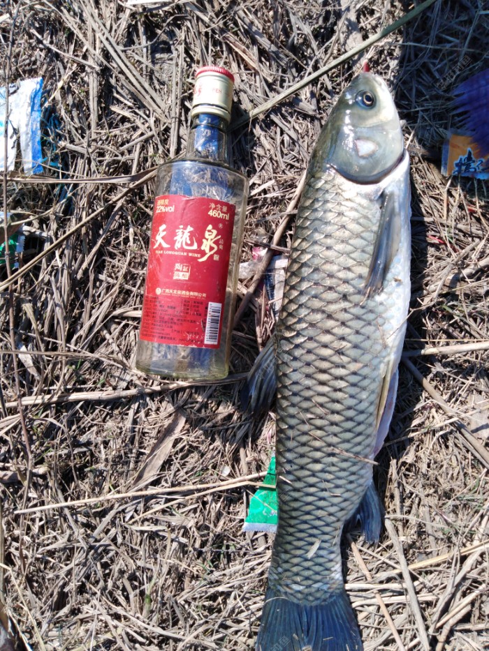 我在的这个位置我觉得是最好的我觉得也是最容易上大鱼的一个位置,图上是个突尖的位置看到没有水深是5米,我钓是5.4米的杆子我,我位置上来是个大回湾这里本地人说经常看见有大的念鱼出现也有不少人钓得,我从下午2点多开始下杆,窝子我没有打因为这里经常有人钓已经不用打窝了,刚开始有口但是都是小鱼口,一直到下午去5点多就开始有大罗非口,心里狂喜抽上来一尾罗非大概3斤吧,自己看图。