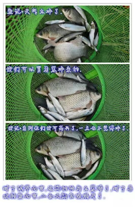 鱼说:天气太冷了。我们可以冒着寒冷来到。我说:看到你们我可高兴了,一点也不觉得冷了。对于试竿而言,这样的结局太寒碜了,对于喜欢钓鱼而言,二条大鲫鱼应该满足了。