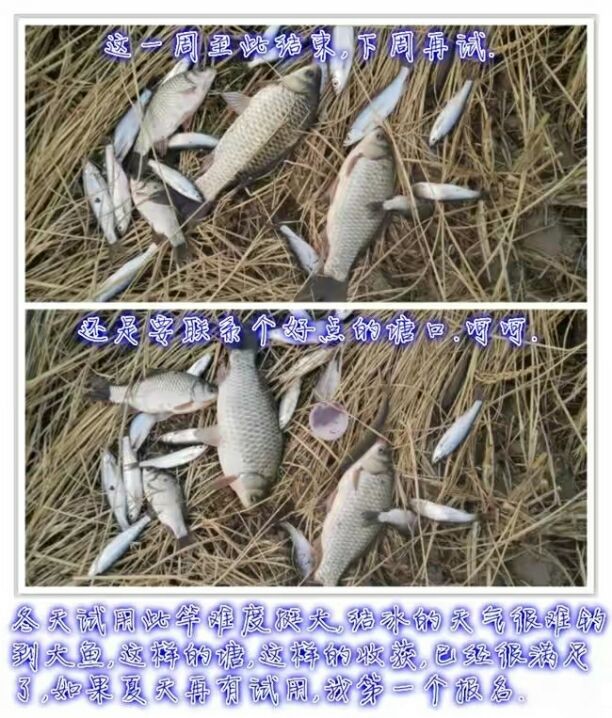 这一周至此结束,下周再试。还是要联系个好点的塘口。呵呵。冬天试用此竿难度挺大,结冰的天气很难钓到大鱼,这样的塘,这样的收获,已经很满足了,如果夏天再有试用,我第一个报名。