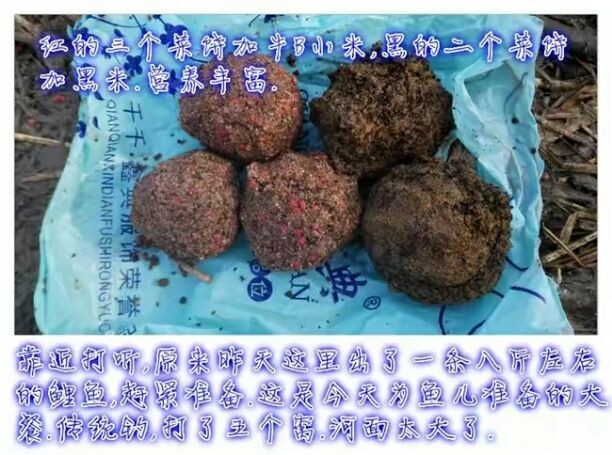 红的三个菜饼加小米,黑的二个菜饼加黑米,营养丰富。靠近打听,原来昨天这里出了一条八斤左右的鲤鱼,赶紧准备。这是今天的鱼儿准备的大餐,传统钓,打了三个窝,河面太大了。