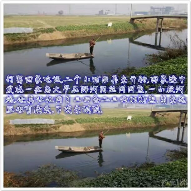 打窝回家吃饭二个小时后再来开钓,回家途中发现一位老大爷在野河用丝网网鱼,一小段河流,还真让他网了三四条二三两的鲫鱼,看来这里也有搞头,下次来试试。