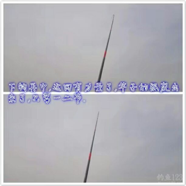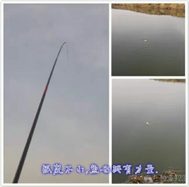 下钩再中,这回有力量了,竿子的弧度出来了,只弯一二节。