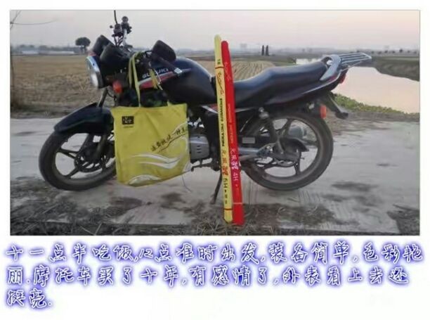 十一点半吃饭,12点准时出发,装备简单,色彩艳丽。摩托车买了十年,有感情了,外表看上去还挺亮。