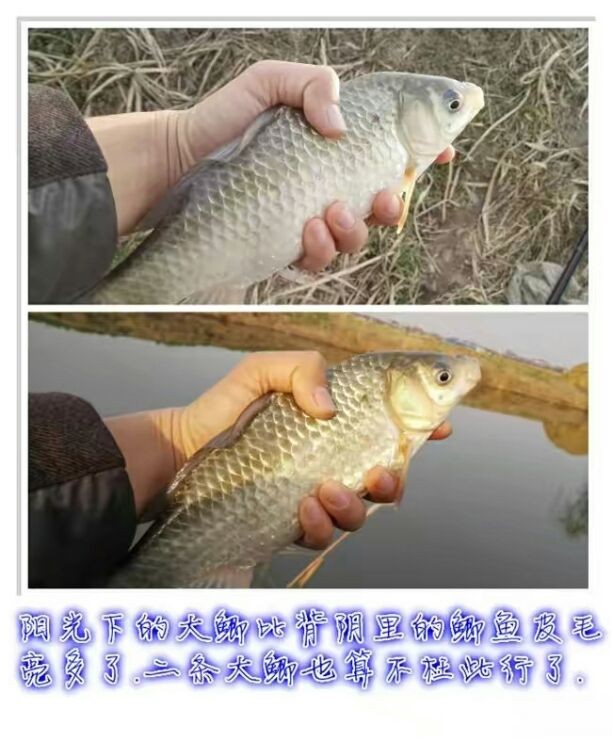 阳光下的大鲫鱼比背阴里的鲫鱼皮毛亮多了(应该说是鳞片了O(∩_∩)O哈哈~),二条大鲫鱼也算不枉此行了。