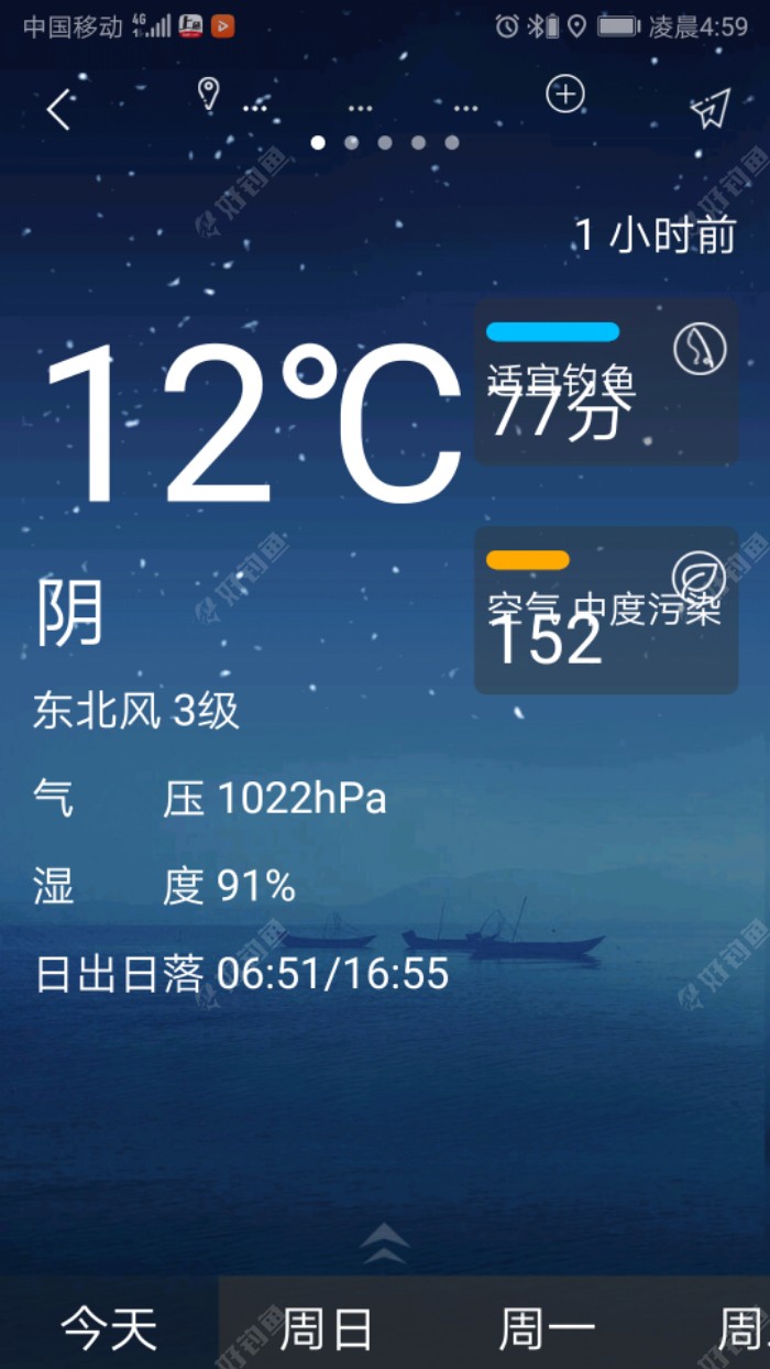 因特殊情况,上星期休息两天没有出门垂钓,人整个星期都如坐针毡,象抽大烟一样毒瘾难熬,感觉?有一项事情没有?去做,盼星期六早日到来。所以上星期就没有在好钓鱼平台上,发表鱼获情况,积分受到影响,还对不起好钓鱼平台上的粉丝和好朋友,请凉解! 一个星期过的真慢,好不容易到了星期五,赶快联系其他钓友,看看星期六有谁去钓鱼,一圈联系下来,有四个人同行。因一星期本市都受大雾霾天影响,天气变的寒冷,早晨气温只有4一5度,大家决定改出门时间,早晨5点钟起床,5点半钟集合。今天早晨起床,发现昨天晚上老天爷又下了一场小雨,把雾霾下没有,对出门行车安全有好处。集合齐后,老饭店,一碗肉丝面下肚,全身感觉暖和(。・ω・。)多了,大家一边吃,一边商量去什么地方钓鱼?因夜里下雨,水边有很多不安全因素,考虑再三,大家一致同意去藕塘船上垂钓比较好(✪▽✪)。吃完饭,开车前往,七点多钟赶到白马湖环湖大道南闸镇藕塘,找到船老大,问是否有船租?船老大说,你们来迟了,三十多条船都租出了,只有另想办法。快跟白马湖南闸镇东边藕塘船老大老张联系,回复有船,一颗悬着的心才放下,转移。在前往途中,我上好钓鱼平台上查看一下,当天的天气预报情况,今天,阴天,东北风3一4级,温度5一12度,湿度91%,气压1022hpa,适宜钓鱼,看这天气,今天会有一个好鱼获,现给自己打个气。