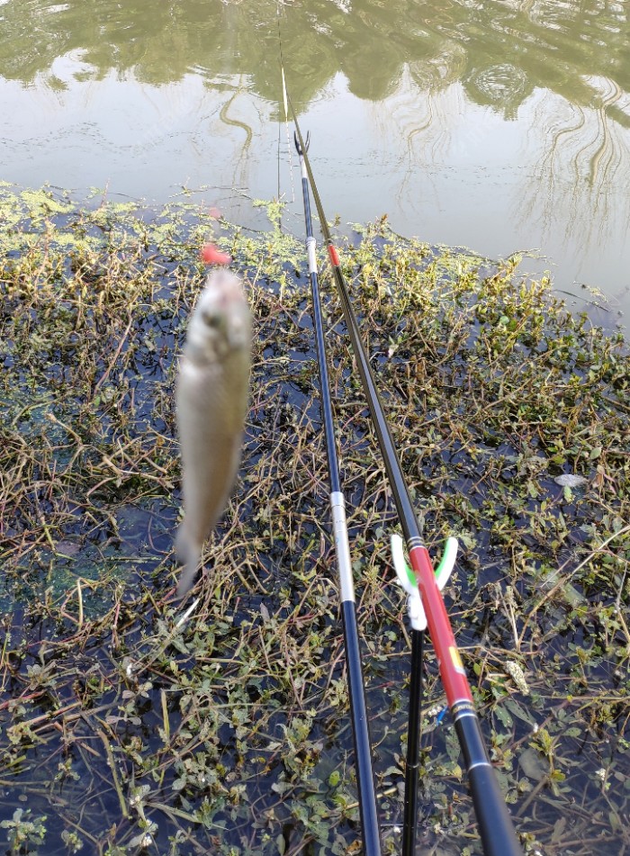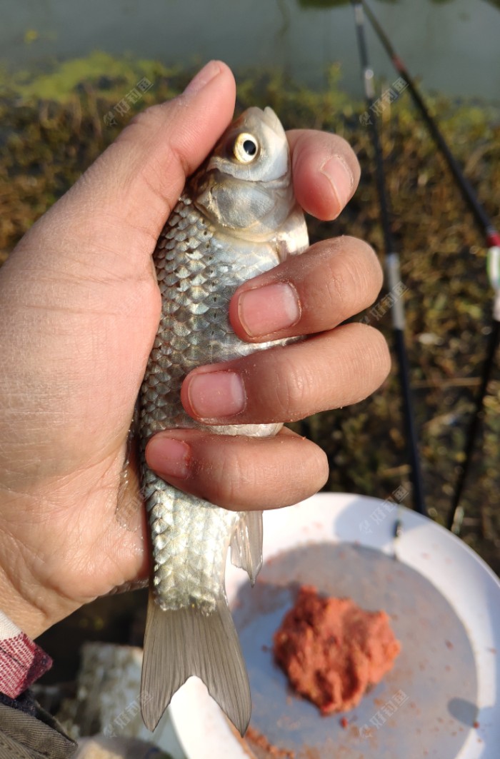 下钩没多久就来口了,不过前四条全都不大,只能继续等待,期望下面会有大的上来。心想小的先来报到,大的紧跟其后?。这时我朋友匆匆赶来了,我告知了我给他提前打的窝位置,并给了一部分我醒好的饵料,朋友之间就要相互帮助,当天他还赠送了我一套硅胶线组,这下我赚大了!?